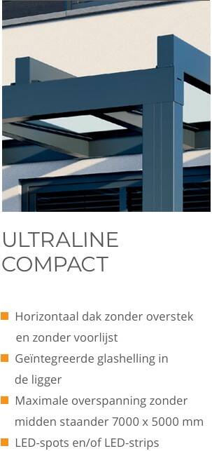 De Ultraline is verkrijgbaar in drie modellen: Classic, Style en Compact. Elk model heeft een eigen uitstraling — van een krachtig overstek tot een volledig strak of compact design — maar deelt dezelfde hoogwaardige afwerking, grote overspanningen zonder middenstaander en de mogelijkheid tot geïntegreerde LED-verlichting.