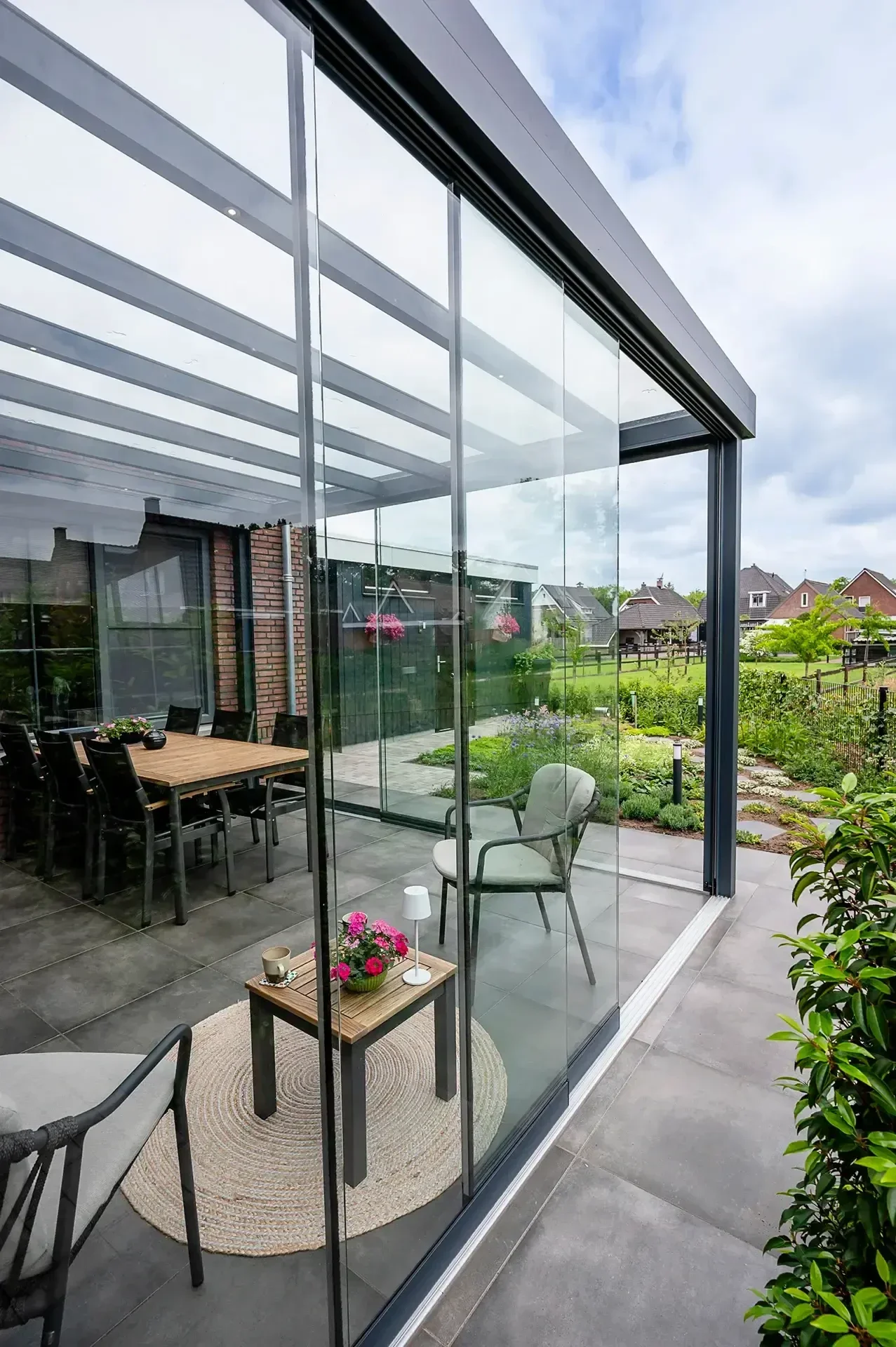 Wat de Verasol Linea onderscheidt van andere overkappingen is zijn unieke design. De smalle staanders zorgen voor een open en ruimtelijk gevoel, terwijl de robuuste dakgoot een solide en betrouwbare constructie garandeert. Dit model is ontworpen om te imponeren en tegelijkertijd optimaal comfort te bieden.
